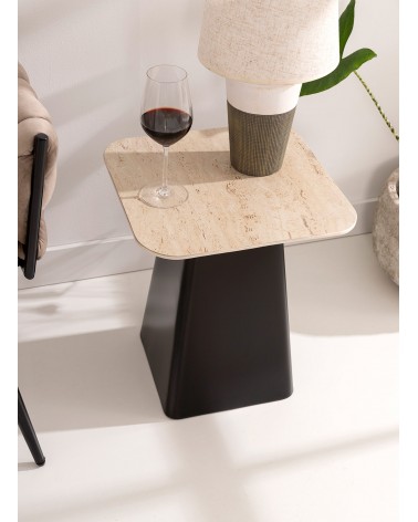 The design of this side table features clean lines and a contemporary aesthetic that seamlessly adapts to a wide variety of decorative styles. Its combination of black metal and travertine marble top adds a touch of modernity and sophistication to any environment.
