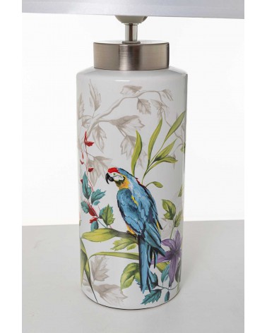 The table lamp adds an elegant touch to your room's decor. Its shade is white with a subtle sheen, and the base is made of ceramic with birds and flowers drawn on it. These drawings transform it from a simple lamp into a design piece, without being overly ornate.