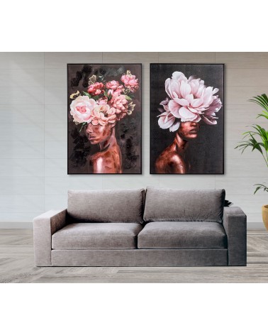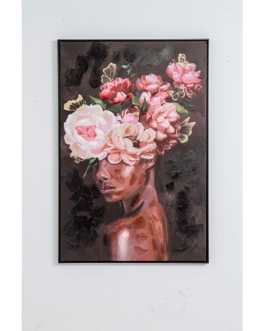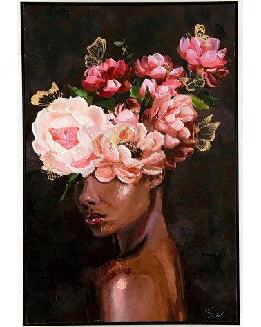 Este cuadro no es simplemente una ilustración decorativa; es una obra cargada de simbolismo. La imagen de una mujer con flores en la cabeza puede interpretarse de múltiples maneras: la feminidad, la naturaleza, la sensibilidad, la fuerza interior. El contraste entre los tonos rosados de las flores y el fondo negro crea un equilibrio visual impactante, captando la atención sin esfuerzo. Es una pieza que invita a la contemplación, que estimula conversaciones y que añade un punto de interés visual donde sea que se coloque.