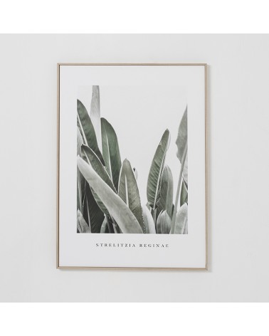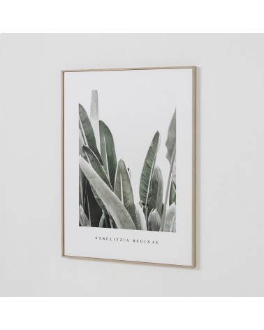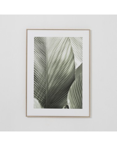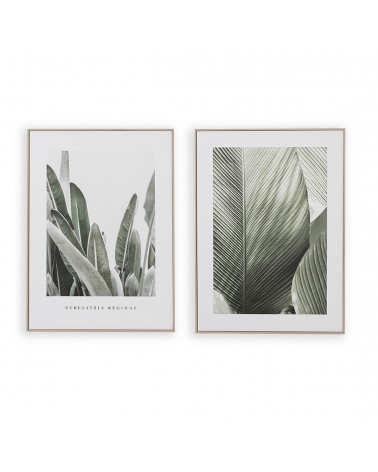 El set incluye 2 láminas impresas en alta definición con ilustraciones de hojas verdes, cada una con marco efecto roble de tamaño 50 x 70 cm.
