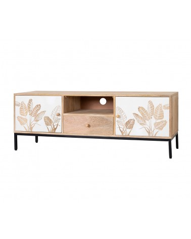 Fabricado con materiales de alta calidad, como el resistente mango y el metal duradero, este mueble de TV está diseñado para perdurar en el tiempo. Las patas de metal aseguran una base estable y sólida, mientras que el mango añade un toque de rusticidad y encanto.