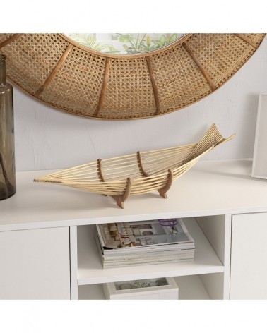 Este centro de mesa es el complemento perfecto para cualquier estilo de decoración que elijas para tu espacio. Fabricado con varitas de madera de bambú, presenta una forma de bandeja con el extremo en forma de cola de pez. Además de ser un accesorio decorativo, este centro de mesa también contribuye al cuidado del medio ambiente, ya que está fabricado con materiales sostenibles y respetuosos con la naturaleza.